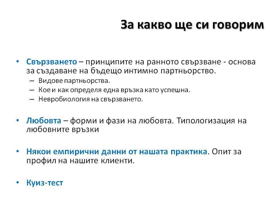 Постепенно забелязваме, че в някои ситуации и с някои хора се чувстваме сигурни и спокойни, а с други не дотам. Докато стигнем до мига, когато се влюбим в някого и си пожелаем да се свържем с този човек “докато смъртта ни раздели”. Какво и как определя успехът ни във връзките, а оттам и щастието в живота ни, ще се опитаме да отговорим с коучинга "Как да изградим успешна връзка".